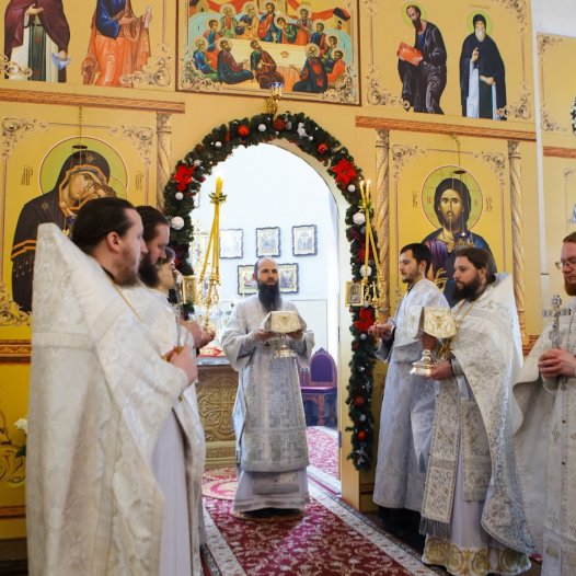 Наприкінці богослужіння архієпископ Сильвестр привітав настоятеля храму протоієрея Василія, вручивши йому пам’ятний подарунок і просфору